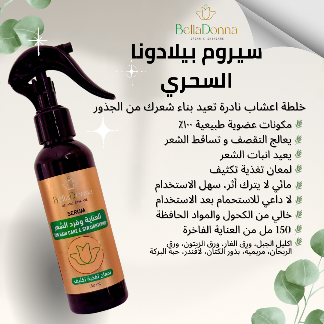 سيروم للعناية بالشعر، من مستخلصات الأعشاب الطبيعية، يقلل من تساقط الشعر ويساعد على إنباته ، لا داعي للاستحمام بعد الاستخدام، لقوامه المائي الذي لا يترك اثر على فروة الرأس